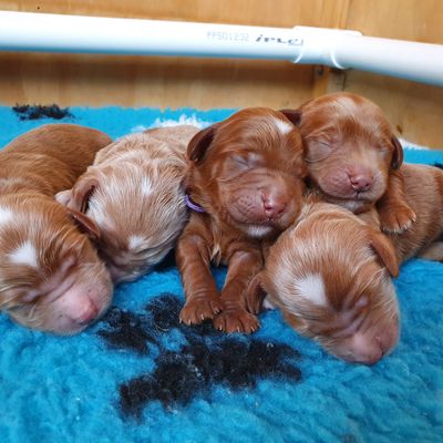 Nina (Clairevale Nina Bonita) x Leo (Clairevale Leonardo welcomed 5 adorable puppies on 05-05-25 in shades of caramel abstract, chocolate phantom and chocolate parti. Nina and her puppies are thriving.